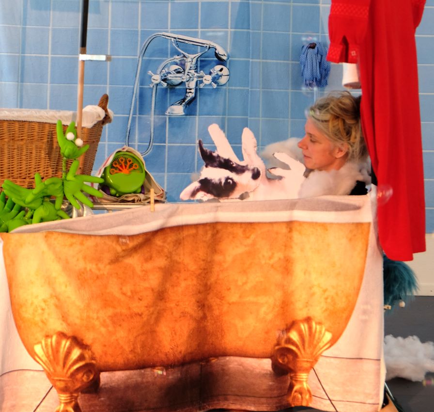 Der sauberste Hund der Welt Das Theater Barbarelli erzählt eine Geschichte über ein sehr ungleiches Paar: Frau Saubermann und ihren Hund. Frau Saubermann lebt allein mit zahlreichen Putzgeräten und ihrem Smartphone in einer immer saubereen Wohnung. Was ihr aber fehlt, ist echte Gesellschaft. Dann kommt ihr Traumhund. Dieser ist so sehr für sie geschaffen, dass er existiert, (fast) ohne Dreck zu machen. Er ist nicht nur ohne Fell und Haar, nein: er ist ganz und gaar unsichtbar... Eine Gerschichte über sein und Haben: Ein bisschen Dreck kann nicht schaden! Mit viel Musik, Gesang und Reimen, EASY-ART Papierobjekten als Figuren und natürlich Frau Saubermann... Spiel Barbarella Maier Figuren & Bühnenbild Barbarella Maier Produktionsleitung & Künstlerische Beratung Iris Keller |